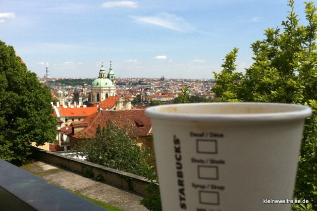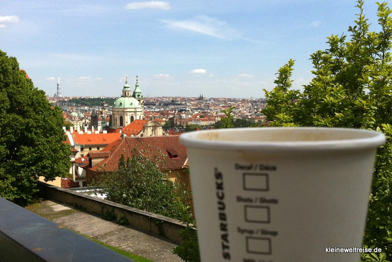 Vor der Prager Burg muss man hinunter steigen in einen Starbucks. In der unteren Etage gibt es eine kleine Terrasse, auf die man sich gemütlich setzen kann. Vom Troubel in der Prager Burg dringt nichts bis hierher, dafür kann man seinen Kaffee mit dem eigenen Namen auf dem Becher und mit toller Aussicht über Prag schlürfen.