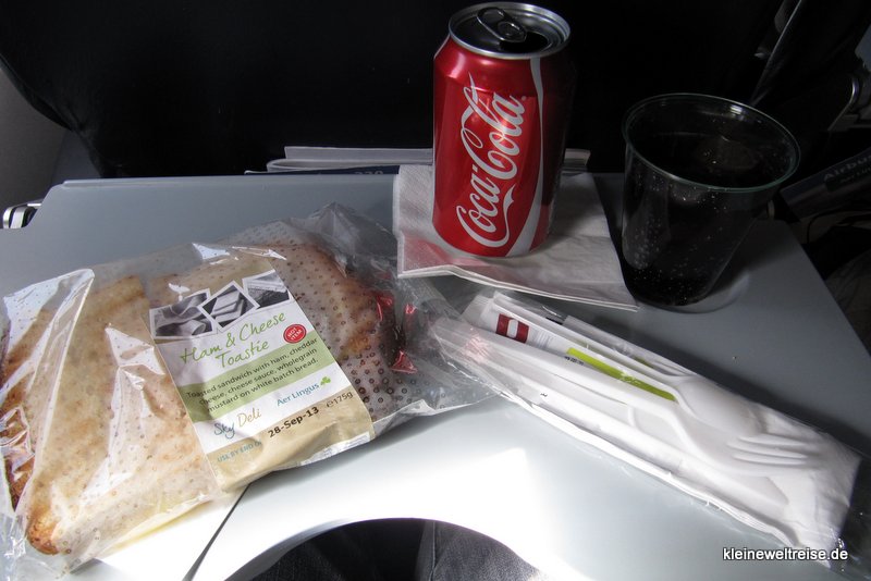 Ich flog die Strecken nach Dublin und nach Berlin mit einem Airbus A320, mit dem Aer Lingus viele Strecken innerhalb Europas bedient. Der Bezug der Sitze sah man an, dass sie etwas älter waren, waren aber dennoch bequem zu sitzen und für die zwei Stunden Flugzeit völlig ok. Die Kabine war insgesamt gepflegt und sauber. Der Sitzabstand war gut bemessen, man kann bequem sitzen und hat ausreichend Raum um die Knie bzw. Abstand zum Vordersitz. Ein Bord-Entertainment-System (Video usw.) gab es nicht. Getränke und kleine Speisen mussten bezahlt werden, durch das Abkassieren nach jedem Drink war der Bordservice dann auch entsprechend langsamer als gewohnt. Ein Softdrink mit 0,3 l kostete 2 EUR, ein irisches Sandwich 5 EUR. Die Flugbegleiter waren irisch herzlich. Der Flug dauerte alles in allem etwa zwei Stunden.