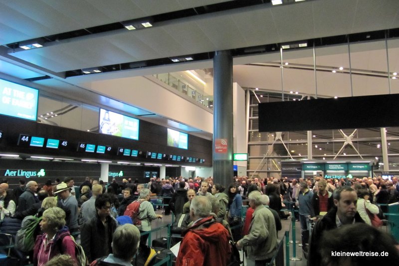 Der Check-in am Flughafen in Dublin (Rückflug) verlief ganz anders: Am frühen Morgen und am Abend ist Hochbetrieb im Terminal 2, der Homebase von Aer Lingus. Alle Check-In-Schalter nehmen Gepäck für alle Flüge an, daher sollte man etwas Zeit mitbringen. Die Schlange bewegte sich aber gut voran, insgesamt waren die zwei Stunden für Check-in und Sicherheit zu hoch angesetzt, es hätte auch mit weniger Pufferzeit geklappt. Dennoch: Es war Hochbetrieb, und auch wenn viel Personal im Einsatz war, dauert es immer lange an internationalen Flughäfen.