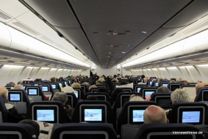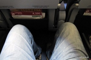 In Abu Dhabi stand der Airbus A 330-200 an einer Außenposition, mit dem Bus ging es zum Einsteigen in das neu ausgestattete Flugzeug. Der Sitzabstand betrug 76 cm, die Beinfreiheit in der Economy Class fand ich gerade so noch akzeptabel. Große Menschen stoßen vermutlich schnell an ihre Grenzen bzw. Knie. Ein Kissen und eine Decke gab es an jedem Platz, eine Schlafbrille, wie ich sie von anderen Airlines kenne leider nicht.