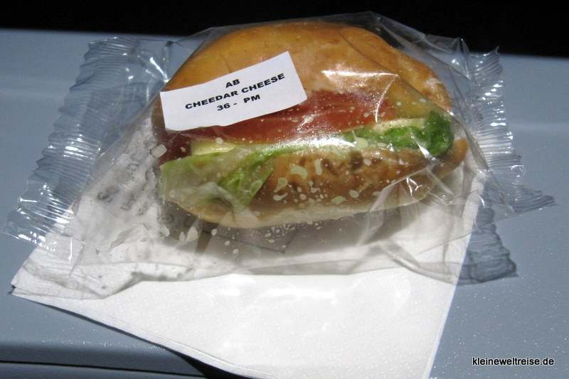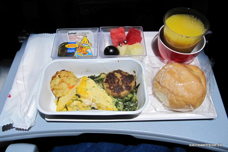 Eine Stunde nach dem Start (mittlerweile 3 Uhr nachts) gab es ein Sandwich und etwas zu trinken. Dann wurde das Licht in der Kabine gedimmt, damit man auf dem 6,5-Stunden Flug noch etwas Schlaf bekommt. Geweckt wurde ich etwas früher als erwartet: Es gab bereits 2,5 Stunden vor der Landung Frühstück! Das war um 5 Uhr Ortszeit am Zielort Berlin. Schade, eine Stunde länger hätte ich gern gedöst. Das Essen war ganz gut, Omelette, Spinat und Boulette, dazu ein Obstsalat.