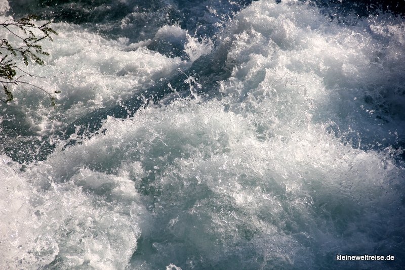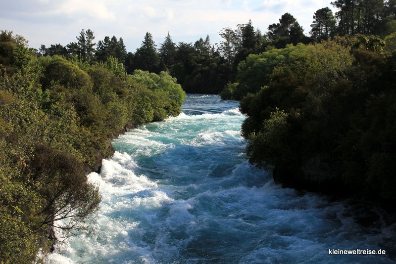 Nächster obligatorischer Taupo-Stopp waren die Huka Falls. Wir waren zwei Mal da, mittags (es ist echt viel los, das reinste Touristen-Mekka) und spät nachmittags (fast leer). Die Huka Fälle sind eine langgestreckte tosende Stromschnelle. Das Wasser lässt seine smaragdgrüne Farbe durch die weiße Gischt erahnen. Der eigentlich ca. 100 Meter breite Fluss wird durch eine 15 Meter breite Schlucht gepresst, am Ende fällt das Wasser noch mal 11 Meter. Das alles gibt ein wunderbar lautes Geräusch.