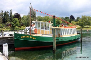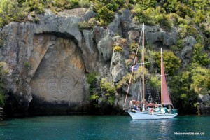 Taupo ist ein netter Ferienort am Tauposee (Lake Taupo). Bei gutem Wetter sieht man hinter dem See die Vulkane Mount Tongariro und Mount Ngauruhoe. Unsere Motivation für eine Dampferfahrt auf dem See war aber eine ganz andere: Die Maori Rock Carvings in der Mine Rock Bay. Sie sind nur vom Wasser aus zu sehen, ganz um die Ecke der ehemaligen Residenz von Rod Stewart. Viele Boote fahren dorthin, unsere Wahl fiel auf den Dampfer Ernest Kemp, ein Nachbau eines Ausflugsschiffs aus den 1920ern. Zu zweit bekamen wir sogar die „Mate Rate“ von nur 70 Dollar für 2 Tickets. Wenn das mal kein Schnäpperchen ist.