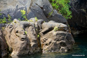 Zwei Stunden schipperten wir über den See, und weil wir die Vulkane nicht sehen konnten (das Wetter) war das Highlight die in Stein gemeißelte Maorikunst. Wir waren voller Erwartungen, weil die Fotos schon ziemlich cool aussahen. So kamen wir vor dem Werk an und mussten den Schauplatz mit einem weiteren Ausflugsboot teilen. Nicht ganz was wir uns vorgestellt hatten, aber trotzdem grandiose Bildhauerei im Fels am See und viel besser als Kunst an einer weißen Wand im Museum.