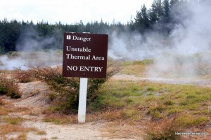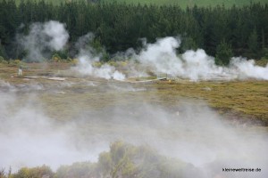 Das war mutig, fanden wir: Als wir uns auf den Weg nach Taupo machten, war am Vortag der Vulkan Tongariro in unmittelbarer Nachbarschaft ausgebrochen. Wir fuhren trotzdem! Musik laut aufgedreht und mit frisch reparierter Windschutzscheibe fuhren wir auf den Thermal Explorer Highway. Nach ein paar Kilometern fiel uns auf, dass uns nur Autos entgegen kamen, in unsere Richtung aber fast keiner fuhr. Oha, das machte uns nachdenklich. Nicht, dass in Taupo am Ende doch Aschewolken vom Himmel fallen?! Zwischenstopp: Auf einem Parkplatz fragte ich deutsche Touristen, die gerade aus Richtung Taupo kamen, wie es dort sei. Das Pärchen guckte verständnislos: „Schön, da ist ein See…“ Nein nein, ich meinte wegen des Vulkanausbruchs. Wieder ein verständnisloses Gesicht. „Vulkanausbruch?!“ Das genügte mir, wir konnten sorgenfrei weiterfahren.