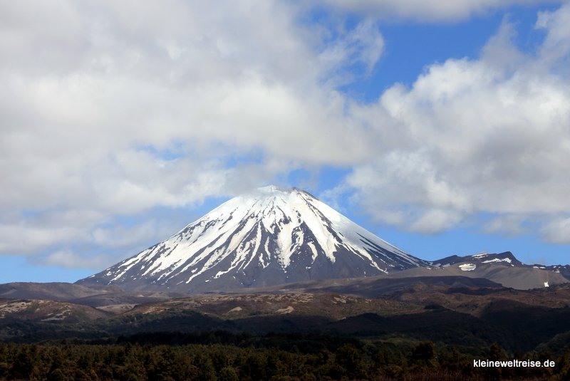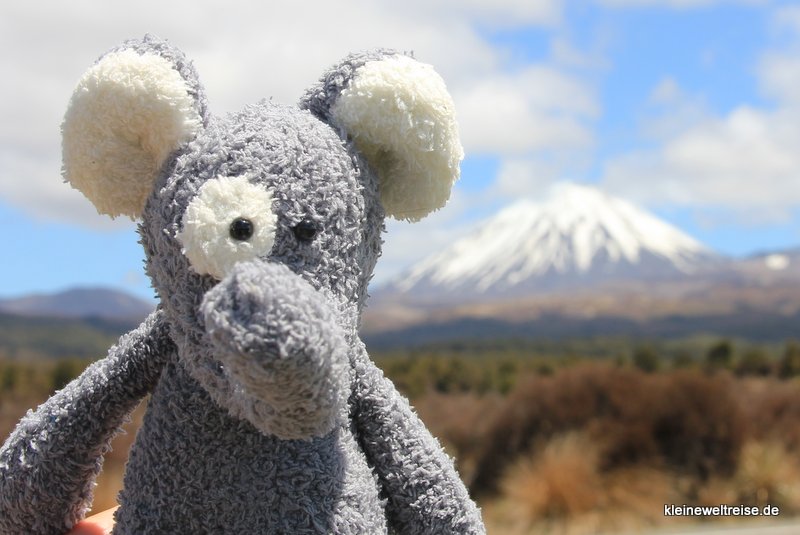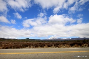 Wir fuhren direkt auf den Vulkan Tongariro zu, und an ihm und seinen Nachbarbergen Ngauruhoe und Ruapehu vorbei. Die Sicht war super, und vor wüstenartiger Landschaft erhoben sich die Vulkane, einer gerade erst aktiv und einer kurz vor dem Ausbruch (Ruapehu wird in den nächsten Wochen bis Monaten erwartet). Sensationell. Das war mal eine Autofahrt mit Aussicht! Wir stoppten einfach am Straßenrand des State Highway 1. Auch wenn die Fotos mal wieder bei weitem den imposanten Eindruck nicht wiedergeben, wir knipsten wie die Weltmeister und Fanta wurde ebenfalls vor die Linse geholt.
