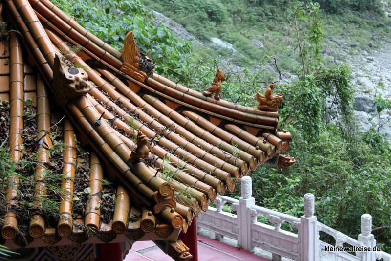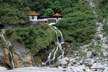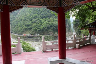 - Nämlich zum Eternal Spring Shrine. Der liegt sehr schön am Berghang. Mitten hindurch fließt ein Bach der direkt unter dem Schrein als Wasserfall ins Flussbett donnert. Durch einen Marmortunnel gelangen wir zum Schrein und konnten uns ein wenig umgucken. Und da sahen wir endlich, wovor wir die ganze Zeit Angst hatten: Der Busparkplatz gegenüber war plötzlich gerappelt voll. Jetzt am Nachmittag waren die Busse aus Taipeh angekommen und drängten sich auf dem kleinen Platz. Machte aber nichts, wir waren am letzten Stopp der Tour im Taroko Nationalpark. Wir überließen die anderen Busladungen ihrem gedrängten Schicksal und fuhren zurück in Richtung Hualien.