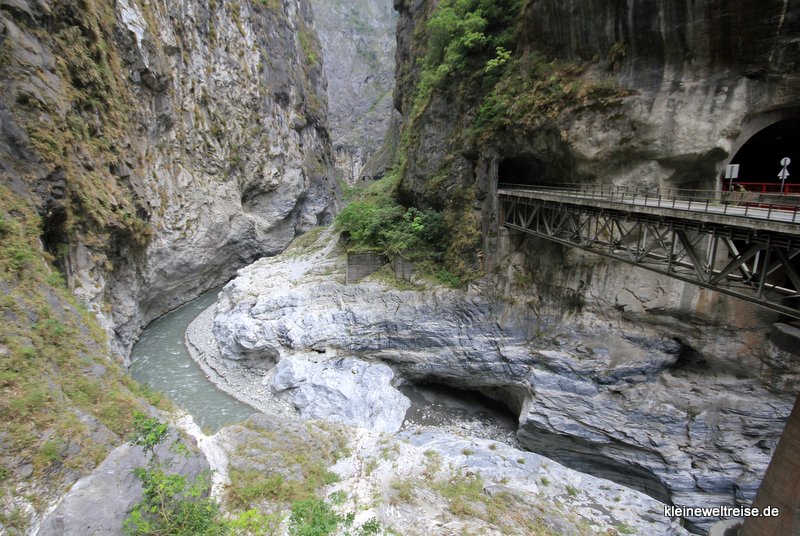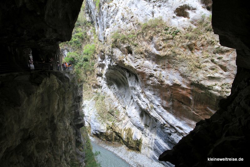 - Am Swallow Grotto Trailempfingen uns die Warnschilder: „Bitte Helm tragen!“ Immer wieder kommt es nach Regenfällen und Erdbeben zu Steinlawinen und Erdrutschen, bei denen auch schon Wanderer ums Leben kamen. Entsprechend vorsichtig ist man geworden. Wir sahen vor uns Gruppen von Taiwanern mit weißen Bauarbeiter-Helmen auf dem Kopf. Sowas wollten wir auch haben, man kann nicht vorsichtig genug sein! Unser Guide schüttelt den Kopf, für uns gibt es keine Helme. Wir würden doch durch einen Marmor-Tunnel laufen, bräuchten wir nicht. Wir hatten trotzdem ein wenig… Respekt. Blieb zu hoffen, dass der Marmor nicht bröckelt.