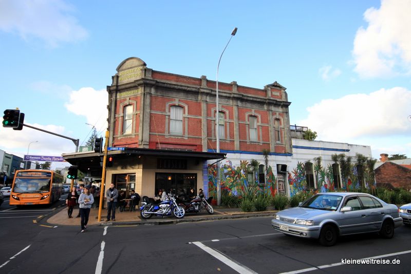 Danach wollten wir wieder einen Bus nehmen, zu einer der Sehenswürdigkeiten der Stadt: dem Mount Eden. Da die Buspläne nicht so furchtbar einfach zu verstehen waren und wir ja gute Erfahrungen gemacht hatten als deutsche Touristen, haben wir im Haupt-Infocenter von Auckland Transport gefragt. Der nette Mann ist auch gleich mit uns vor die Tür gekommen um uns die richtige Bushaltestelle zu zeigen. Der Bus sollte ja in vier Minuten fahren, und es sei ein wenig schwer zu finden. Vor der Tür: „Hier müsste es sein… Ihr nehmt einfach eine Linie mit den Nummern zwischen 479 und 503… Moment mal, da stehen die falschen Busnummern dran… hmmm…“ (der nette Mann fragt den Busfahrer des Busses der gerade dort steht, der darauf beharrt nicht zum Mt. Eden zu fahren und weist auf eine Haltestelle eine Straße weiter). Wir schlagen mit höchster Wertschätzung für sein Engagement das Angebot aus, nochmal im Gebäude im Computer zu gucken, und nehmen eine andere Buslinie die auf unserem Plan verzeichnet ist. Die fährt auf einen Umweg zum Ziel, so bekommen wir auch noch ein paar Viertel von Auckland zu sehen.