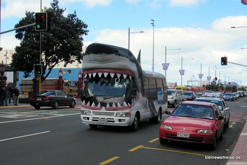 Zum Aquarium Kelly Tarlton’s nahmen wir den Shuttlebus. Obwohl am Abholort keine Bushaltestelle war, erkannten wir ihn sofort: Das Fahrzeug war „verkleidet“ wie ein Hai. Ein guter Start für unsere Erkundung der einzigen antarktischen Pinguine Neuseelands und weiterer Meeresbewohner wie Haie, Clownfische und Stachelrochen.