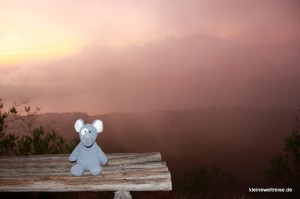 Und dann sind wir fünf mit unserem Guide zu Fuß losgewandert. Es war stockfinster, jeder hatte nur seine Taschenlampe. Fanta haben wir extra mit einer Stirnlampe ausgestattet, er hat sogar seinen Rüssel tief gehalten, damit es keine Schatten gibt. Wie eine kleine Wanderung sind wir also losgelaufen, der Weg war aus Schotter mit gelegentlichen großen Steinen, aber wir hatten ja unsere Lampen. Die Yoga-Lady und der Guide haben ein ziemliches Tempo vorgelegt, Fanta musste sich mit seinen kurzen Beinchen ganz schön ranhalten. Nach etwa einer Stunde wurde der Weg dann zu einem schmalen Pfad. Der Pfad wurde steil. Der steile Pfad wurde zu einer Kletter-Route über Felsen. Und das Tempo der Yoga-Lady und des Guides blieb gleich schnell. Also kletterten wir in einem rasanten Tempo mitten in der finsteren Nacht mit unseren Taschenlampen den steilen Vulkanhang hinauf. Vor uns eine Schlange von kleinen Lichtern die sich den ganzen Berg hinaufschlängelten. Das waren die Taschenlampen der vielen anderen Touren mit ihren Guides. Und hinter uns ein schnaufender Fanta, dessen Quengeln über die Strapazen immer weniger wurde je schneller sein Atem ging.
