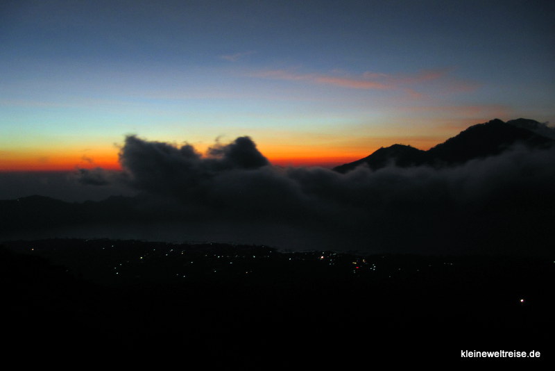 Mitten in der Nacht haben wir also unsere Wanderschuhe angezogen und um 2:30 Uhr ging es mit dem Auto los zum Vulkan Gunung Batur. Dort gab es erst mal ein Frühstück mit Bali-Kaffee und Banana-Pancake mit Schokolade, die wir gemeinsam mit unserer kleinen Reisegruppe einnahmen: Ein Finne, er hieß Tim, der einen sehr netten Eindruck machte, aber sehr still war. Und eine Kalifornierin namens Lindsay die wegen des Yogas nach Bali gekommen war und die Tour auf gut Glück gebucht hatte. Soll heißen sie hat erst auf dem Weg zum Vulkan erfragt was wir eigentlich vorhaben.