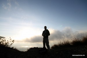 Ganz genau in dem Moment, als sich der erste Streifen Licht am Horizont abzeichnete, kamen wir an der ersten der beiden Gipfelhütten an. Ein kühler Wind spendete Erfrischung und wir sahen so langsam die Schatten der gegenüberliegenden Berge und die Spiegelungen im See. Dann ging es weiter zur zweiten Hütte zum zweiten Frühstück. Es gab gekochtes Ei, welches die Guides anscheinend auf den heißen Dämpfen des Vulkans gegart haben und Brot mit Banane, worüber sich Fanta ganz besonders gefreut hat. So saßen wir da oben und schauten in den Sonnenaufgang und fröstelten im kalten Wind.