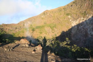 Danach haben wir dem Krater noch einen Besuch abgestattet. Der sah ziemlich tief und steil aus und Äffchen kamen aus ihm rausgeklettert. Aus verschiedenen Spalten kamen heiße Schwefeldämpfe. Der Vulkan ist ja noch aktiv und zuletzt im Jahr 2000 ausgebrochen. Es war sehr beeindruckend, das erste Mal am Rand von einem Krater zu stehen.