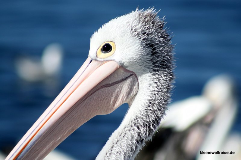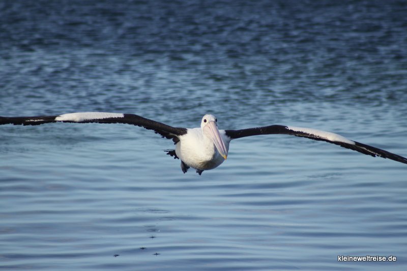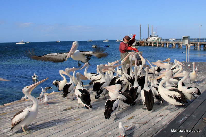 In Kingscote, der „Stadt“ auf Kangaroo Island, gibt es einen Mann, der jeden Abend Pelikane füttert. Die Pelikane wissen das schon und warten schon lange vor Beginn der Vorstellung um 17 Uhr am Hafen. Fanta hatte ein wenig die Befürchtung, dass ihm die Pelikane zu nahe kommen. So eine kleine Sockenpuppe passt schließlich locker in den Schnabel eines Pelikans. Und während der Vorstellung hat Fanta auch gelernt, dass Pelikane ihre Nahrung nicht kauen, sondern am Stück herunterschlucken. Aber dennoch hat sich Fanta für ein einziges Foto schnell in Position gestellt und ist dann wieder schnell in Sicherheit zu uns. Denn als der Fisch serviert wurde, ging ein regelrechter Kampf zwischen den Vögeln um das Beste Stück Fisch los, mit fiesen Versuchen dem Konkurrenten den Fisch aus dem Schnabel zu ziehen. Als der Fisch gegessen war, war wieder Friede.