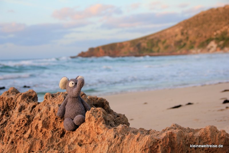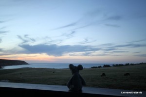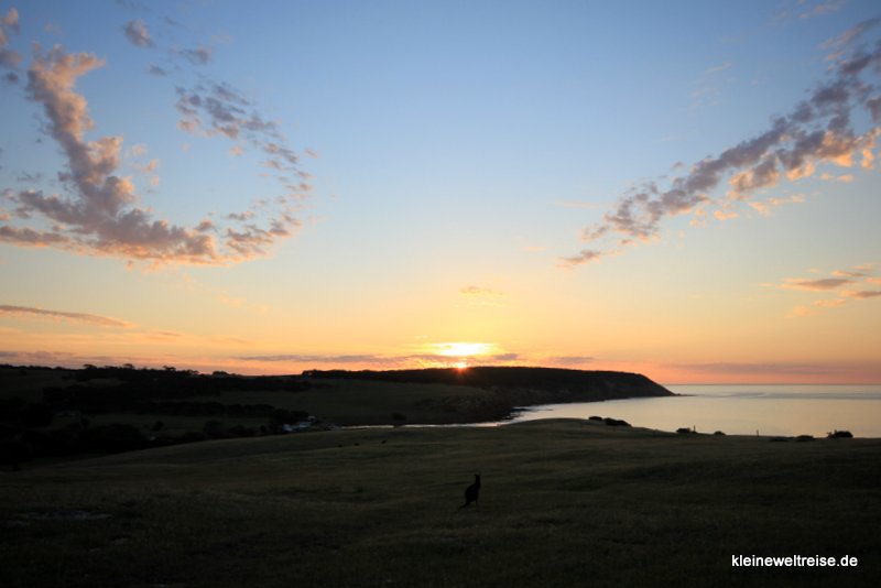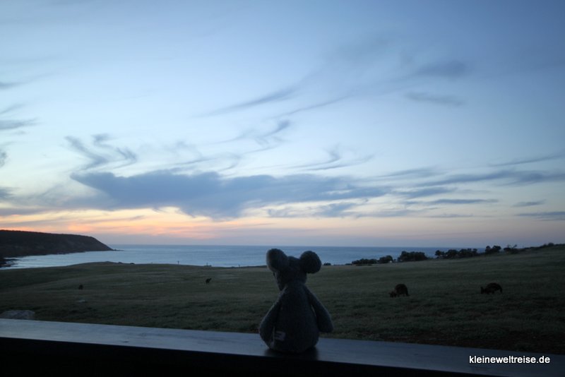 So fuhren wir zu unserer Bleibe, den Waves and Wildlife Cottages. Wir fuhren 45 Minuten durch die Natur, kaum eine Siedlung. Und als wir gegen Abend ankamen, saßen schon die Kängurus vor der Veranda auf der Wiese vor den Klippen und über der Stokes Bay ging die Sonne unter. Wahnsinnig schön. Kängurus vor der Haustür und Sonnenuntergänge sollten uns jeden Abend unseres Aufenthaltes hier begleiten.