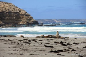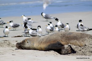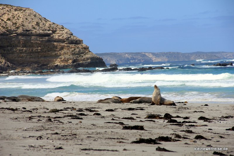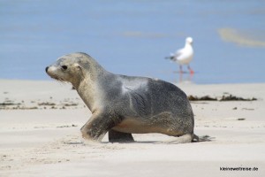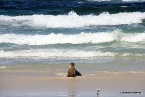 Beschaulicher ging es in der Seal Bay bei den Seelöwen zu. Nach drei Tagen auf See zum Fressen kommen die Seelöwen an den 5 Kilometer langen Abschnitt von Kangaroo Island. Hier bleiben sie dann drei Tage zum Kraft tanken bevor sie wieder drei Tage rausschwimmen. Mit einem Guide sind wie runter an den Strand in die Seelöwenkolonie. Wir mussten dabei leise sein, immer geschlossen als Gruppe gehen und überhaupt die Seelöwen nicht ärgern. Der Grund: die Tiere sind schneller und stärker als Menschen. Scheint also gar nicht so ungefährlich zu sein, am Strand die süßen kleinen Seelöwen-Babys zu fotografieren. Ein paar tolle Fotos haben wir dennoch geschossen.
