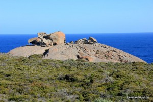 Ein paar hundert Meter weiter befindet sich eine weitere sprichwörtlich bemerkenswerte Gesteinsformation: Die Remarkable Rocks. Sie sind durch Erosion entstanden und sehen aus wie gesplitterte Murmeln die auf einer Kuppel liegen. Aus der Ferne wirken sie gar nicht so groß, aber wenn man zum Vergleich auf dem Foto die Menschen anschaut, die daneben stehen, sieht man wie mächtig sie eigentlich sind.