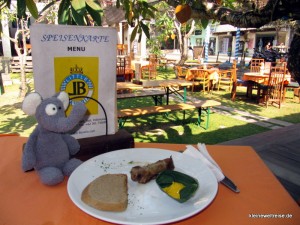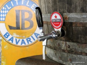 Fanta im Litle BavariaBierfass im LBHerz im LBDie Freude für Fanta war riesig, er ist sofort los das Little Bavaria zu inspizieren. Seine erste Enttäuschung: Roswitha war gar nicht da. Und dann stellte er fest: Es gab gar nicht so viele Bierbänke wie er erwartet hatte, eher Tische und Stühle und eine Lounge-Ecke. Und aus dem großen Fass an der Bar wurde Bintang Bier ausgeschenkt! Nach einem Blick in die Karte war er aber ein wenig beruhigt, immerhin gab es „German Würstel.“ Und weil Fanta so ein absoluter Bratwurst-Fan ist und er sich nach all den Bananen in den letzten Tagen so nach einer Wurst sehnte, hatte die Kellnerin seine Bestellung schon aufgenommen noch bevor wir einen Blick in die Speisenkarte werfen konnten.