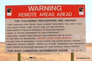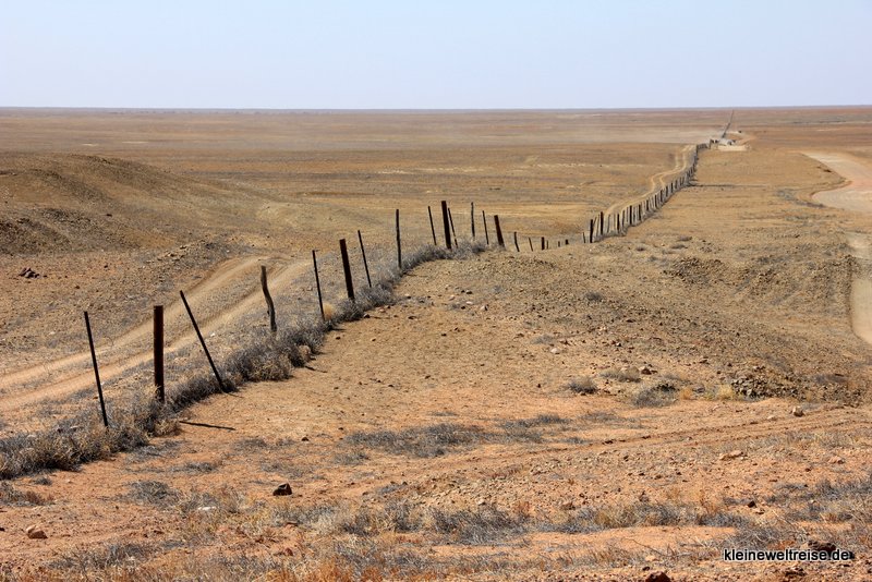 Das Outback wird in dieser Gegend durchschnitten vom längsten Zaun der Welt. Paul erzählt uns, dieser Zaun sei länger als die Chinesische Mauer. Die 5300 Kilometer lange Barriere soll Dingos von den Viehherden und Farmen südlich/östlich von ihr weghalten. Anscheinend töten Dingos Schafe nicht nur als Nahrung, sondern auch einfach so weil sie einen so starken Jagdtrieb haben. Jetzt teilt der Zaun also Australien in Nord/West (mit vielen Dingos) und Süd/Ost (mit wenig Dingos und vielen Schafen).