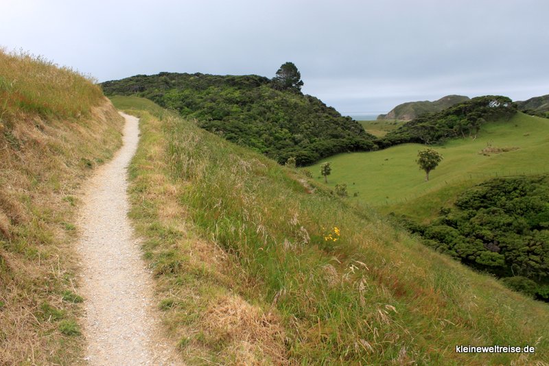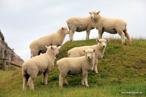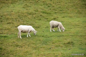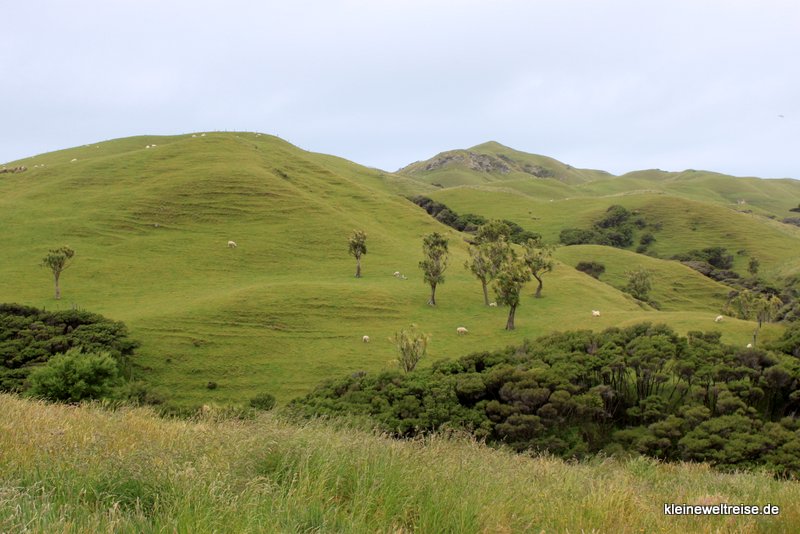 Wir fahren weiter zum Cape Farewell. Um auf den Parkplatz zu kommen, müssen wir das Tor einer Schafweide öffnen, hindurch fahren und wieder schließen. Nach dem Parken gehen wir durch ein weiteres Gatter auf die nächste Weide. Über die Wiese erklimmen wir eine kleine Anhöhe. Die Schafe hier müssten doch Menschen gewöhnt sein, kommen ja 70.000 pro Jahr, denken wir. Aber nein, die sind richtige Angsthasen. Vor allem vor Kameraobjektiven hauen sie sofort ab.