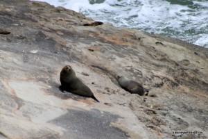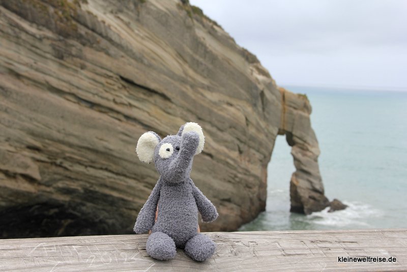 Oben auf der Schafswiese befindet sich eine kleine Aussichtplattform. Das ist der offiziell nördlichste Punkt der Südinsel. Der Blick die Klippen hinunter ist mal wieder beeindruckend. Wir stehen viel höher, als wir dachten. Unten schlagen die Wellen gegen den Fels und einen Felsbogen. Auf einem Stein chillen zwei Seehunde, im Wasser davor schwimmt ein dritter seine Runden. Hinter uns blökt ein Schaf. Schön.
