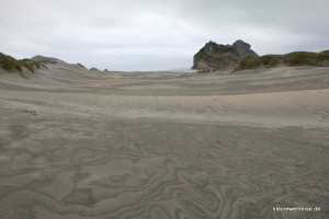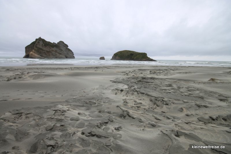 Der weitere Weg zum Wharariki Beach führt wieder über Schafweiden zu den Dünen. Über die letzte große Düne kommen wir an den Strand und müssen feststellen: Wieder ein spektakuläres Fleckchen Erde! Die Dünen aus marmoriertem Sand gehen langsam über in den Strand. Felsen und Inselchen liegen direkt vor uns mit ihren Höhlen. Sonnenuntergänge sollen hier der Hammer sein. Ein Spaziergang bei Ebbe ebenfalls. Wir kommen bei Flut und an einem wolkigen Tag, und sind schon beeindruckt. Trotz Regen ist es einfach schön hier.