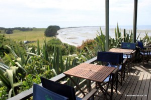 In Puponga, der Siedlung ganz am Ende der Straße, stoppen wir am Parkplatz mit Café. Hier ist auch gleichzeitig der Infopoint. Für 50 Cent gibt es eine Übersichtskarte. Zufällig treffen wir den Besitzer des Wharariki Beach Campingplatzes im Café, ich glaube er heißt Dion. Er zeigt uns wo die Aussicht über die Klippen toll ist (Cape Farewell), wo der Robben-Kindergarten ist (die zweite Insel am Wharariki Beach) und wann man am besten über den Wharariki Beach wandert (zwei Stunden vor dem tiefsten Punkt der Ebbe bis zwei Stunden danach).