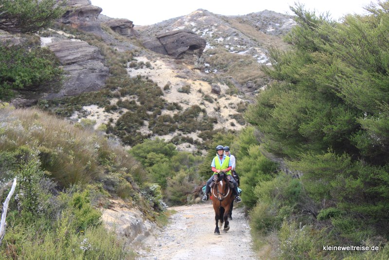 So geht die Wanderung auf die Klippen los an einem kleinen inoffiziellen Parkplatz. Der felsige Weg schlängelt sich durch die Büsche in Richtung Klippen. An einer Kurve etwas weiter vor uns biegt etwas Signalgelbes um die Ecke und ruft uns ein gut gelauntes „Wie geht Euch zweien?“ zu. Drei Frauen auf ihren Pferden, jede mit Warnweste bekleidet, kommen auf uns zu. Das Reiten hier sei traumhaft, erzählen sie. Und: „Ihr habt Euch eine tolle Wanderung ausgesucht, die Aussicht oben wird fantastsich sein!“ Das klingt doch mal toll, wir wandern weiter um nach oben zum Pillar Popint Lighthouse zu kommen.