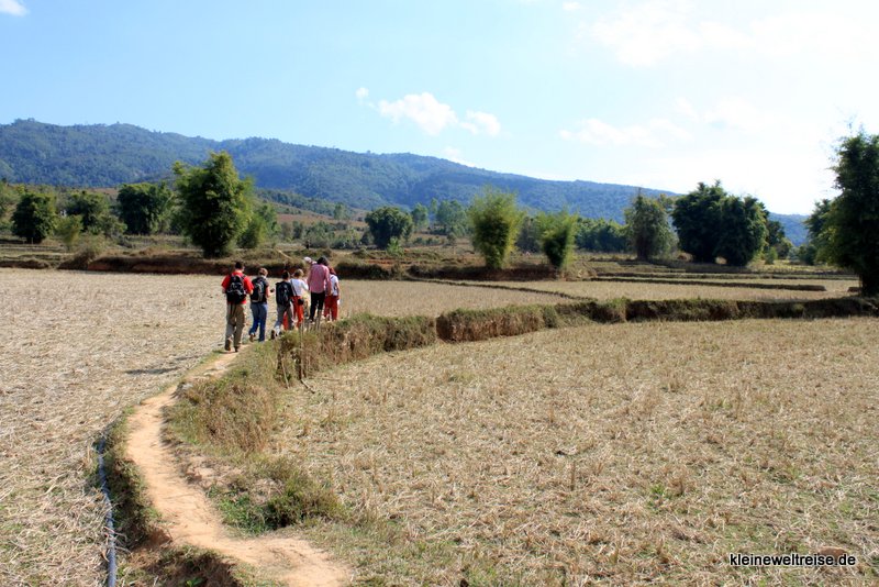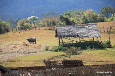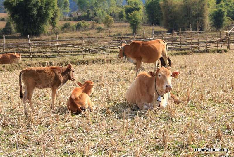 Zur Ebene 3 (Site 3) laufen wir ein ganzes Stück über vertrocknete Reisfelder. In dieser Region wird nur einmal im Jahr geerntet. Jetzt grasen hier Kühe und Wasserbüffel. Der Weg ist links und rechts markiert, außerhalb der Markierungen könnten noch Mienen und Bomben liegen. So erreichen wir Ebene 3, die ruhig mitten in den Feldern und der wunderschönen Landschaft von Nordlaos liegt.