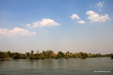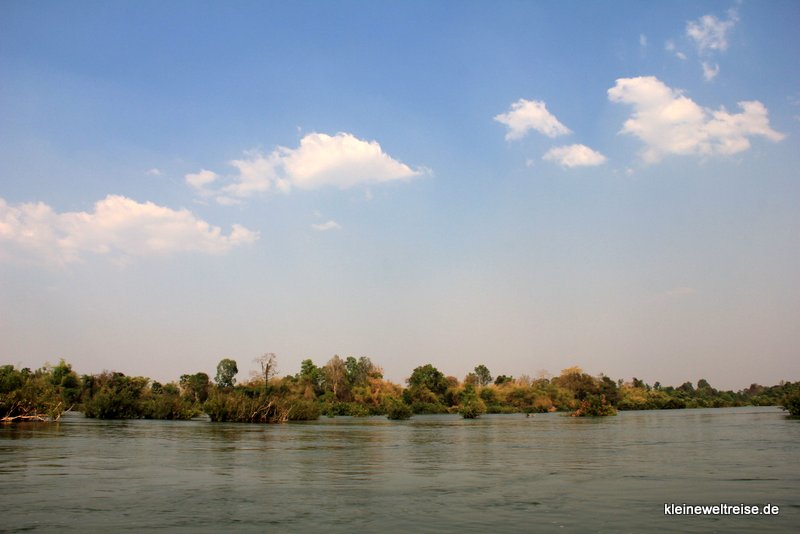 Am Nachmittag sitzen wir also in dem kleinen Boot und fahren durch die Stromschnellen des Mekongs, immer dicht vorbei an Steinen und den kleinen Busch-Inseln, die so typisch sind für die 4000 Islands.