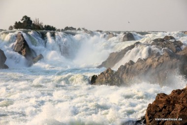 Zum Wasserfall müssen wir dann doch noch ein Stück laufen, zu nah ranfahren ist dann doch zu gefährlich. Von einer Aussichtsplattform haben wir eine tolle Sicht auf den beindruckenden Khon Phapheng. Hier fließt wirklich viel Wasser hinunter! Über die Felsen klettern wir nochmal herunter zum Mekong für ein paar weitere Fotos.