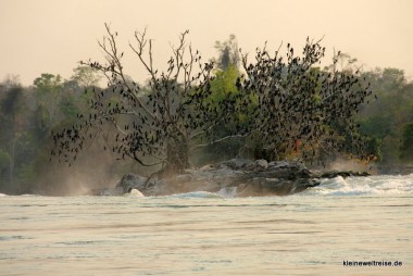 4000 Islands auf dem Mekong Khon Phapheng - die MekongfälleVögel auf dem Baum direkt am WasserfallSonnenuntergang am MekongSonnenuntergang am MekongHier auf den 4000 Islands  (Si Phan Don) befindet sich der größte Wasserfall Asiens, Khon Phapheng. Der gesamte Mekong rauscht hier in die Tiefe. Das ist übrigens auch der Grund, warum der Fluss nicht in seiner ganzen Länge schiffbar ist.