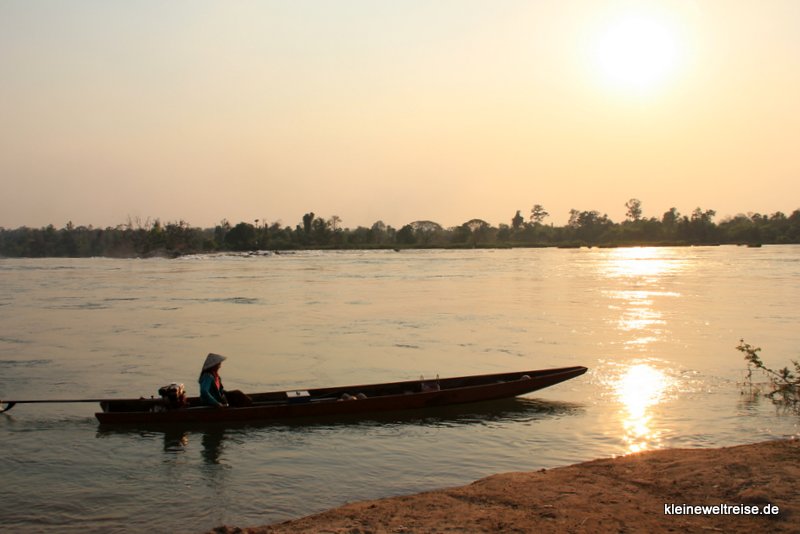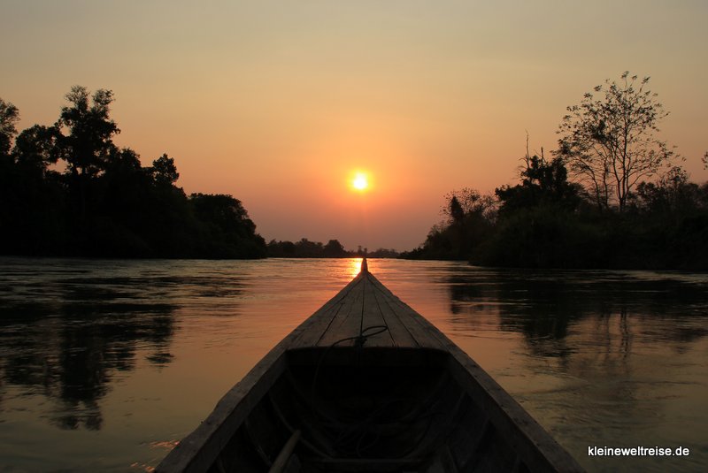 In den Sonnenuntergang fahren wir mit dem Boot zurück nach Don Det, diesmal gegen die Strömung und gegen die Stromschnellen. Ich bin froh, dass der Motor durchhält. Die Sonne färbt sich knallrot und versinkt hinter den Bäumen und dem Mekong.