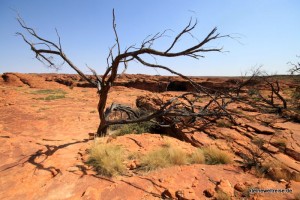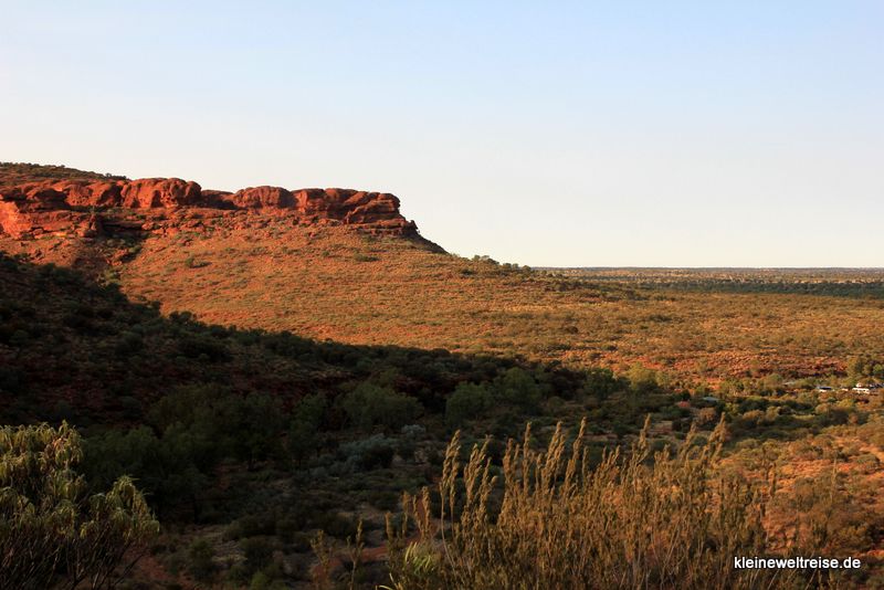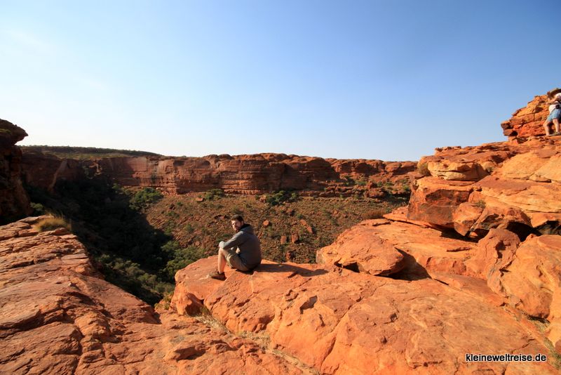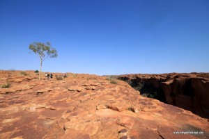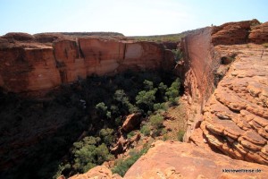 Der Kings Canyon ist die Attraktion im Watarrka National Park. Um die riesige gähnende Schlucht führt ein Rundweg (Kings Canyon Rim Walk), der nur 6 Kilometer lang ist, für den man aber 3,5 Stunden Zeit einplanen sollte. Schon allein weil man an so viele tolle Stellen kommt, die einen ausgiebigen Fotostopp wert sind. Dabei sollte man aber immer darauf achten, nicht zu nah an die Kante der Schlucht zu kommen, davon wird erstens das Foto selten besser und zweitens weht hier oben manchmal ein kräftiger Wind. An ausgesuchten Stellen warnen Schilder vor einem Absturz an der Kante, Fanta war so nett vor einem Schild zu posieren.