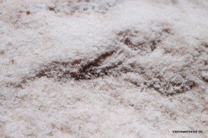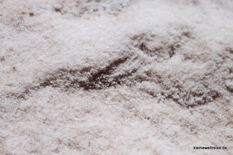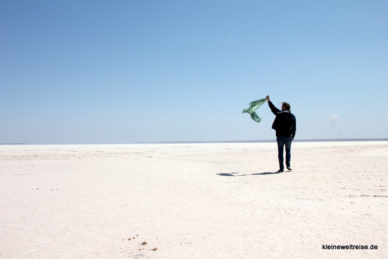Der Salzsee wirkte fast wie eine Schneelandschaft im Winter. Mit dem Unterschied, dass das Salz viel hartnäckiger in Fantas Fell hängengeblieben ist, als Schnee jemals sein könnte. Aber Fanta musste ja unbedingt sein „Engel im Schnee“-Foto machen. Schon allein weil unsere Outback-Reisegruppe ihn mittlerweile ins Herz geschlossen hat. Fanta war ganz hin und weg von der jungen Dame aus Hongkong, die ihm den Spitznamen „Eli“ gegeben hatte. Da posiert man doch gern.