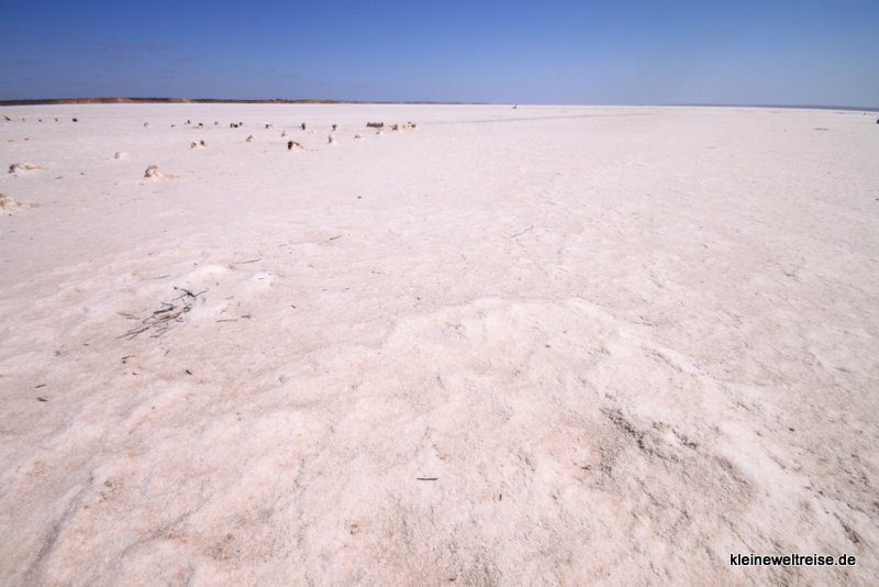 Ganz ernst gemeint: rund um den ausgetrockneten Salzsee Lake Hart liegen Bomben in den Büschen. Richtige Bomben. Das Militär hat dieses Gebiet früher zu Testzwecken genutzt. Jetzt ist der Lake Hart beliebt bei Touristen und Besuchern, die sich die endlose weiße Weite anschauen möchten.
