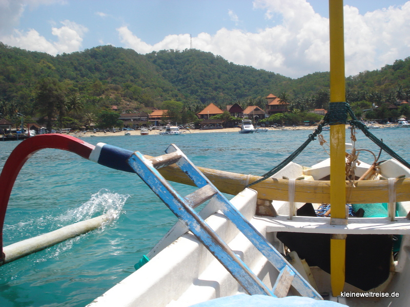Fischer am StrandAnsonsten liegen hier viele der balinesischen Boote mit den beiden Baumstämmen links und rechts. Mit einem solchen Boot haben wir übrigens auch eine Schnorcheltour gemacht und die bunten Fische am Riff angeschaut. Mit eben solchen Booten fahren auch die Fischer raus und bringen ihre Fische direkt an den Strand wo sie mittags umgeladen werden in Richtung der lokalen Restaurants.