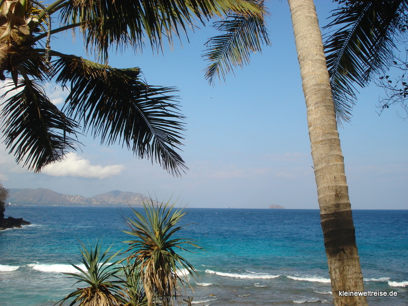 Fanta am StrandWir sind die Ostküste in der Blue Lagoonein wenig weiter hoch gefahren nach Padang Bai. Hier ist ein Hafen und ein bisschen Strand. Unter anderem die bekannte Blaue Lagune. Der Grund für ihre Bekanntheit: Der Sand ist weiß und nicht schwarz. Das habe ich dann auch erfahren, fast alle Strände an Balis Ostküste haben schwarzen Sand. Die Blaue Lagune war ganz nett, allerdings räumt hier niemand den Strand auf, und das Meer bring viel viel vieeeel Plastik und abgebrochene Kakteen.