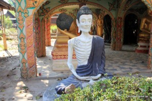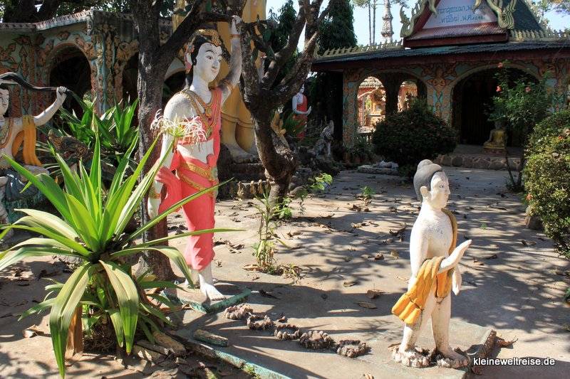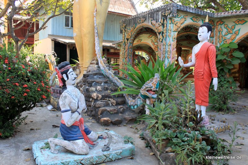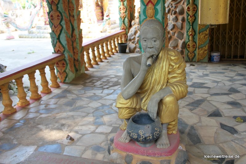 Der Wat Thawet, so heißt der Ort, liegt abseits aller ausgetretenen Touristenpfade, sogar abseits fast aller Pfade. Denn auch für die Locals ist der Ort nicht sonderlich interessant, es gibt viel wichtigere Tempel in der Region. So bleiben vor allem die Schüler der Schule gegenüber, die oft hierher kommen, um über die Geschichte des Buddhismus zu lernen.