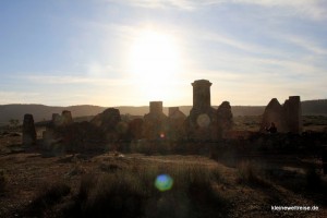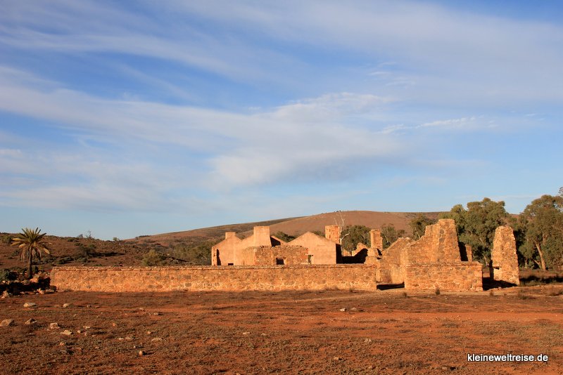 An einigen Stellen in den Flinders Ranges findet man verlassene Höfe. Als die ersten Europäer das Land besiedelten, versuchten einige ihr Glück mit Schafherden. Auf ein, zwei gute Jahre folgen in dieser Gegend immer so sechs sieben schlechte Jahre mit Trockenheit. Wer also in den guten Jahren hierher kam und seine Existenz aufbaute, schaffte es oft nicht durch die trockenen Jahre und musste seinen Hof aufgeben. Das Kanayaka Homestead ist so ein verlassener Hof, dessen Ruinen wir bei Sonnenaufgang besichtigten.