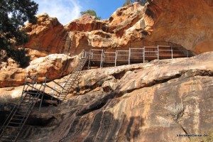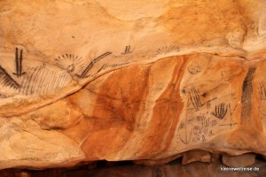 Bevor die Europäer hier ihr Glück versuchten und anscheinend nicht immer fanden, war dieses Land tausende Jahre von Aborigines bewohnt. In den Yourambulla Caves findet man ihre Spuren. Hier haben sie Botschaften für ihre Nachfahren in Form von Malereien hinterlassen. Ein Zeichen können wir mittlerweile entschlüsseln: zwei parallele halbe Pfeile nach unten bedeuten Känguru. Um Kängurus ging es auf jeden Fall in der Zeichnung! Außerdem war die Höhle ein super Ort um nachmittags der heißen Sonne zu entfliehen und ein wenig zu chillen.