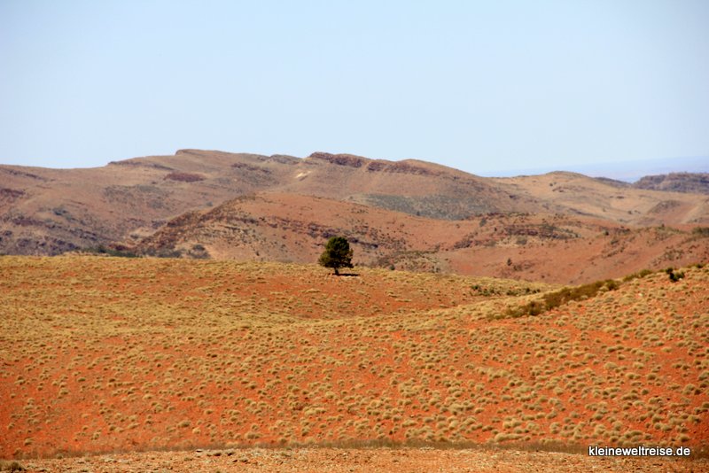 Unsere größte Wanderung ging dann durch Wilpena Pound. Der Wanderweg ist äußerst beliebt, wir waren nicht allein. So kam es, dass wir den Berg hinauf wanderten und alle paar Minuten die uns entgegenkommenden Wanderer grüßten. „Hi“ „How are you?!“ „G’day!“. Auch in Australien grüßt man beim Wandern. Still und langweilig wurde es so nicht. Oben angekommen, wurden wir mit einem Lookout und einer tollen Aussicht belohnt. Dazu gab es Cracker und Wasser und eine Foto-Pose von Fanta auf dem Zaun vor Panorama.