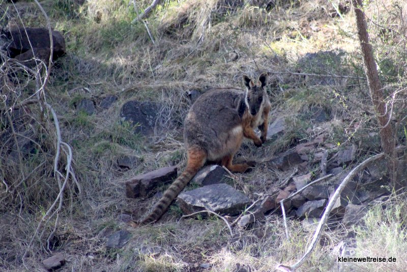 Im Warren George gibt es etwas ganz seltenes zu sehen: Die vom Aussterben bedrohten Wallabys mit dem gelben Schwanz. Nur noch 12 Stück soll es von Ihnen geben. Um sie zu sehen, sind wir kurz vor Sonnenuntergang durch das Tal gewandert. Dann kommen sie nämlich zum Fressen von den Felsen herunter. Wir waren ganz still und Fanta ist mit besonders vorsichtigen Schritten auf ganz leisen Sohlen geschlichen. Wir wurden belohnt, mindestens 4 der 12 seltenen Tiere haben wir sehen können. Ganz friedlich haben sie zwischen den Felsen gegrast und gechillt. Wie schön es hier draußen doch sein kann.