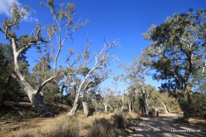 Auf einer Wanderung darf man aber nicht immer unbesorgt sein. Einige Bäume werden hier Widow-Maker genannt. Diese Art des Eukalyptus kann in trockenen Jahren ganzen Ästen das Wasser abschneiden, sodass sie absterben. Irgendwann fällt dieser Ast dann runter, und es gab wohl schon Leute die dabei das Pech hatten unter diesem Baum zu stehen.