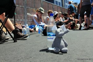Ab 15:00 Uhr wurde es voller. Ab jetzt standen wir (tja, keinen Klappstuhl dabei, was?). Die Sponsoren verteilten Goodies: Autogramm-Pappen vom Air New Zealand, Fähnchen von der Post. Die erste Reihe bekam Gandalf-Hüte ab. Das hieß für uns in der zweiten Reihe: Sicht auf das Geschehen nur noch zwischen Zauberer-Hüten hindurch.