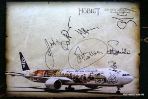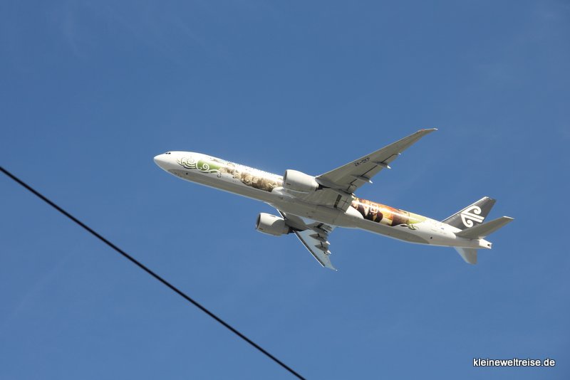 Der Moderator bittet uns alle hochzugucken, eine tolle Überraschung wäre da im Anflug. Die nagelneue Boeing 777-300 der Air New Zealand in Hobbit-Bemalung schwebt im Tiefflug über den roten Teppich. Das Flugzeug ist riesig, wow!