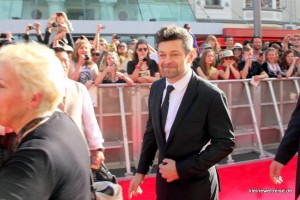 16:30 Uhr ist es soweit: Auf der aufgestellten Videowand sehen wir einen weißen BMW um die Ecke biegen. Peter Jackson steigt mit seiner Tochter aus. Die Moderatoren sprechen ihn direkt an und befinden ihn und die Dreharbeiten in Neuseeland für großartig. Auf der Videowand geht es weiter: Andy Serkis kommt, cooler Typ im Interview. Das ist also Gollum!