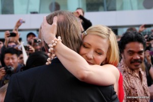 Cate Blanchett ist jetzt da und begrüßt Hugo mit einer herzlichen Umarmung. Neue Kostprobe des bestimmten Heranrufens: Caaate!!! Auch Cate dreht sich um und kommt. Als sie uns ein Autogramm geben möchte, schreibt der Stift nicht, einen Ersatzstift haben wir nicht. Schade, auch kein Autogramm von Cate, nur die ersten Buchstaben Ihres Namens in grau.
