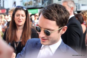 Die volle Kunst ihres Könnens zeigen uns die jungen Premiere-Profis als Elijah Wood auf der falschen Seite des roten Teppichs Autogramme gibt und Anstalten macht, weiterzugehen. Simpler Trick: Richtig laut den Namen rufen, aber richtig laut, so als ob man sein Leben auf ihn gewartet hätte: Elijaaaaah, Eeelliiiijaaaahhh!!!! Kommt im Fernsehen albern rüber, direkt am Teppich funktioniert es ausgezeichnet. Elijah dreht sich im Weggehen um und kommt zu uns.